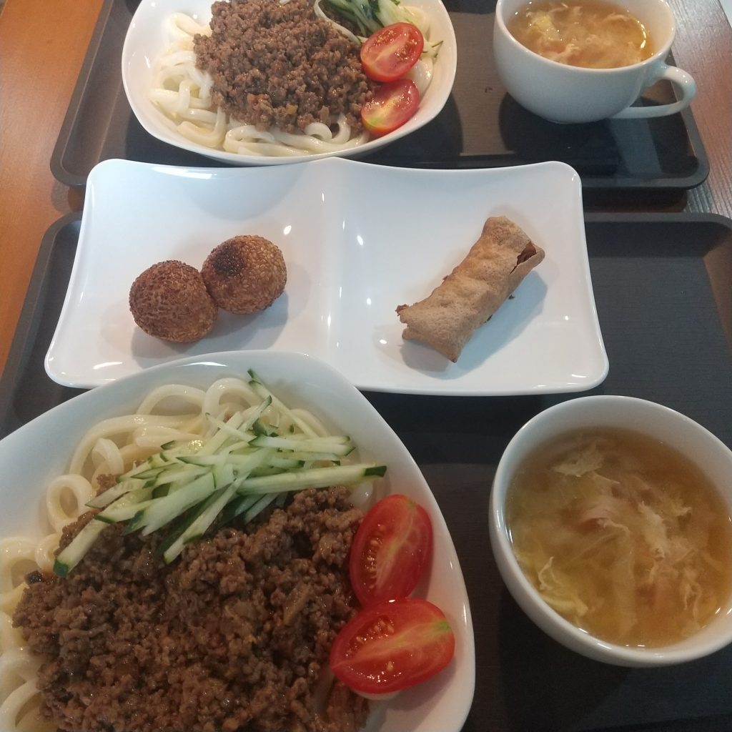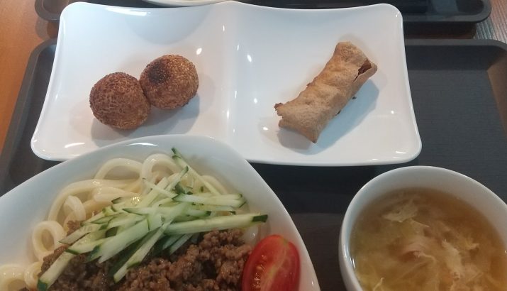 今日のランチメニューは、ジャージャーうどん・ゴマ団子・ミニ春巻き・スープです!