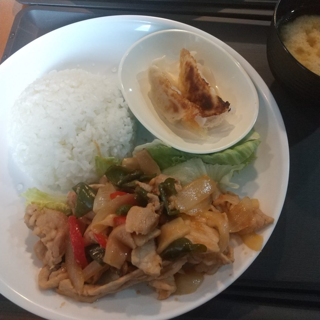 今日のランチメニューは、豚肉と野菜の甘酢炒め・餃子・味噌汁です!