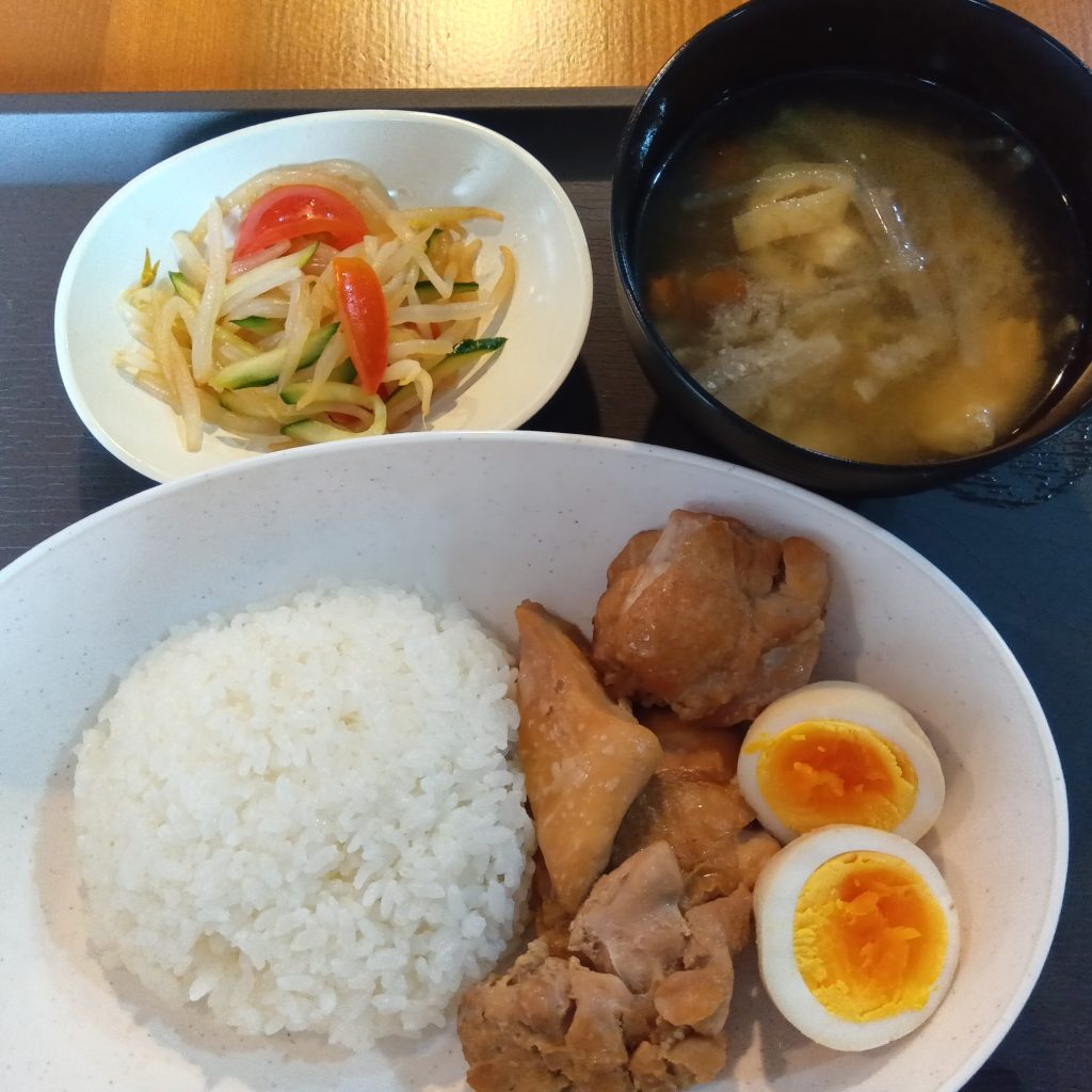 今日のランチメニューは、鶏の角煮風・もやしのナムル・味噌汁です!