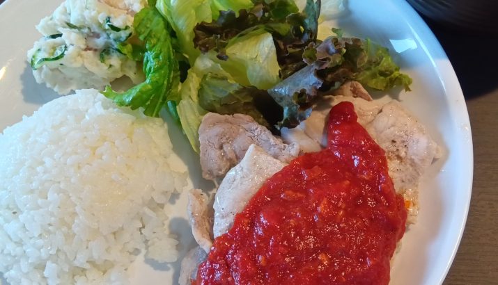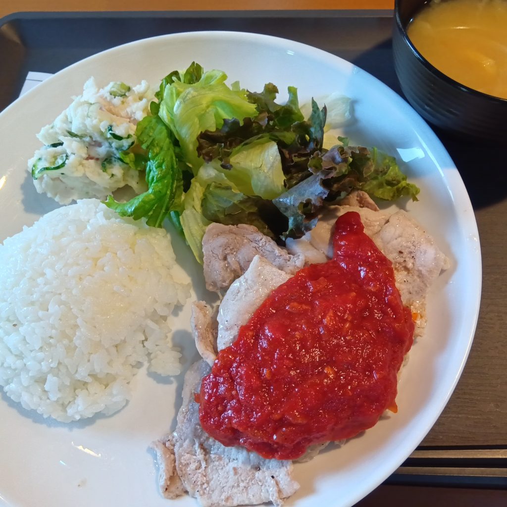 今日のランチメニューは、ポークソテートマトソース・みそ汁です!