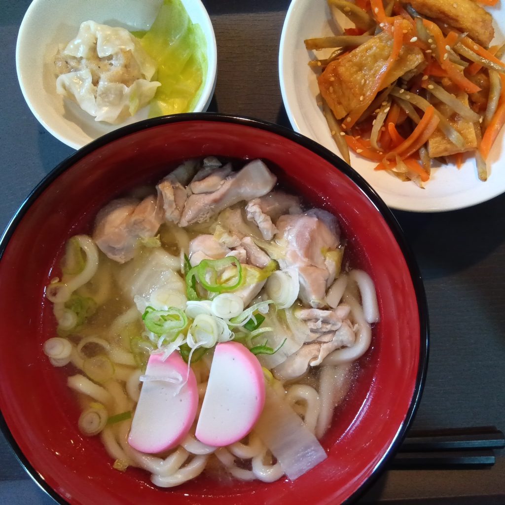 今日のランチメニューは、鶏だしうま塩うどん・きんぴらごぼう・シュウマイです!