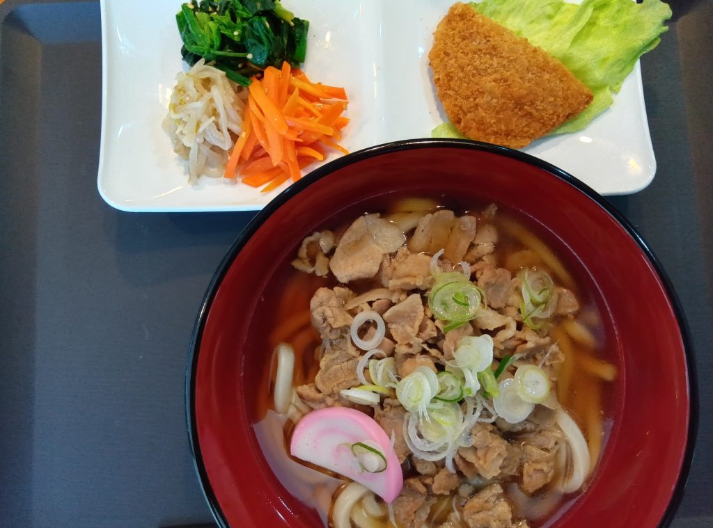 今日のランチメニューは肉うどん・ミニハムカツ・三色ナムルです!