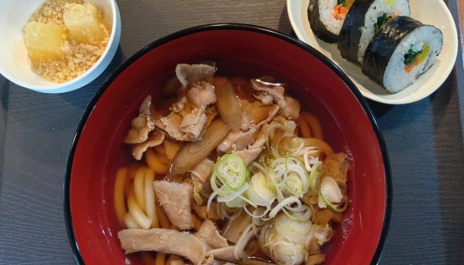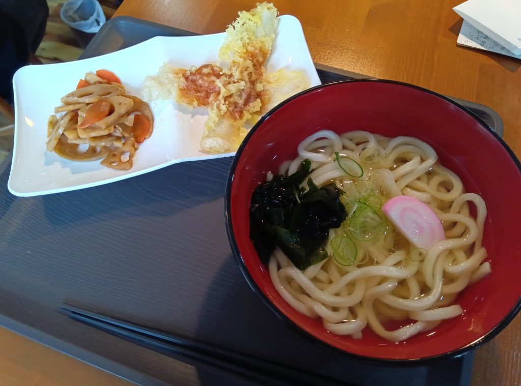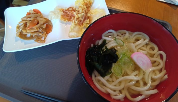今日のランチメニューはちくわ天うどん・れんこんキンピラです!