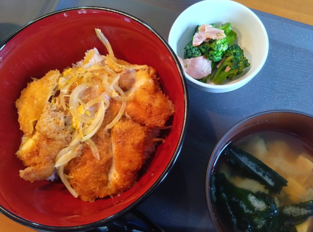 今日のランチメニューはチキンカツ丼・ブロッコリーとベーコン炒め・みそ汁です!