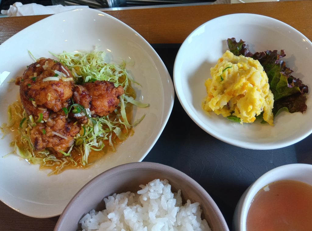 今日のランチメニューは油淋鶏・ポテトサラダ・スープです!