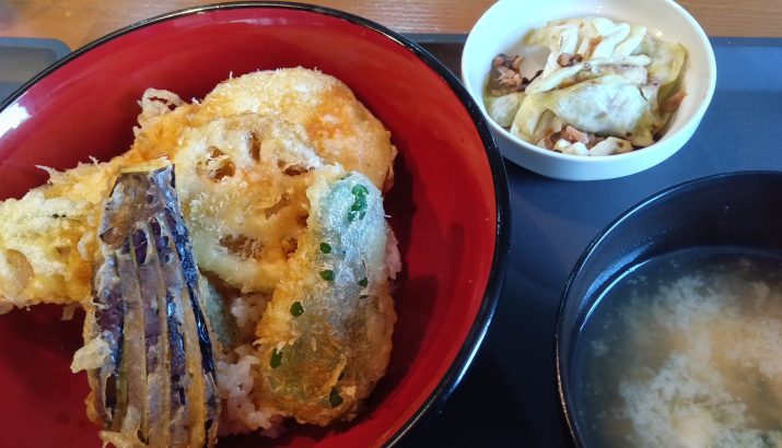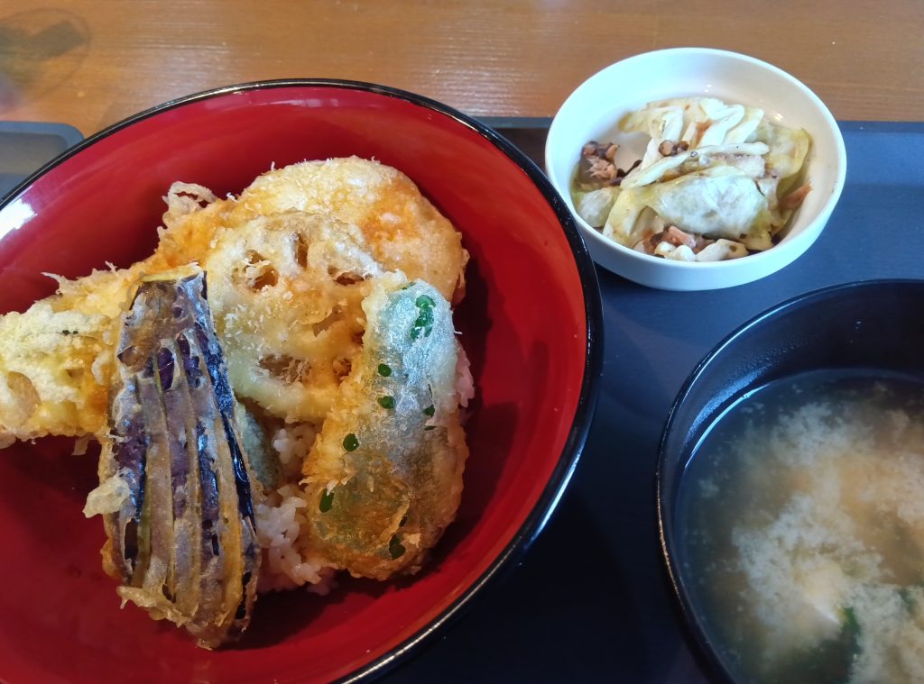 今日のランチメニューは鶏と野菜天丼・キャベツとツナの塩昆布和え・味噌汁です!