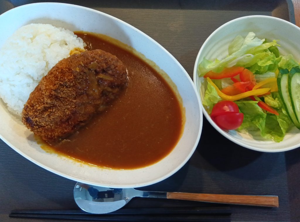 今日のランチメニューはメンチカツカレー・野菜サラダです!