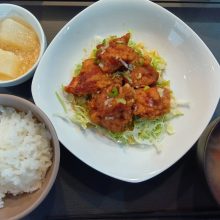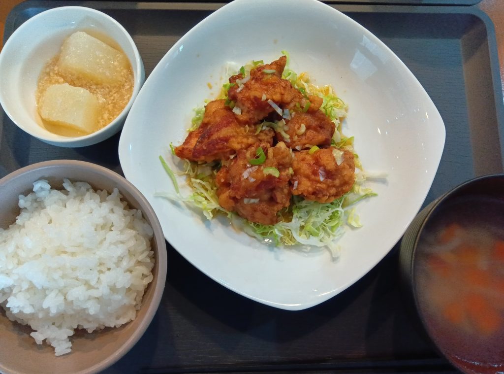今日のランチメニューは油淋鶏・大根そぼろ煮・スープです!