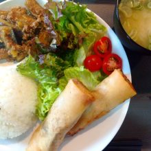 今日のランチメニューは、鶏むねと野菜のフライ・サラダ・味噌汁です!