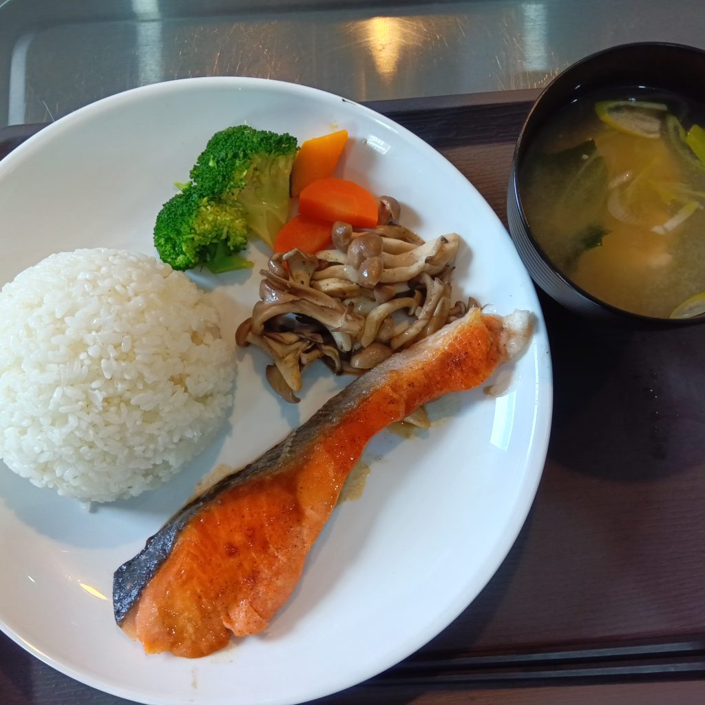 今日のランチメニューは、鮭のムニエル・温野菜・きのこのソテー・味噌汁です!