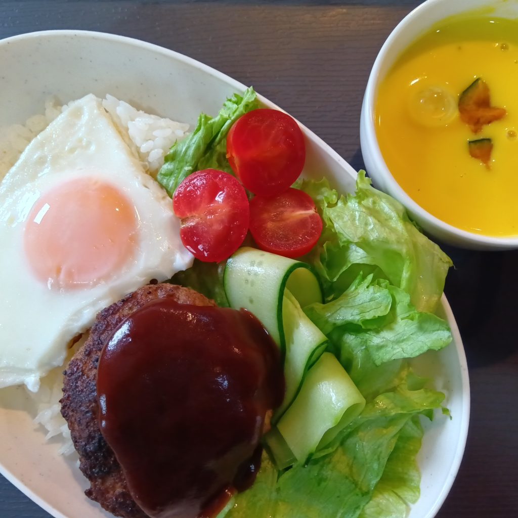 今日のランチメニューは、ロコモコ丼・かぼちゃスープです!