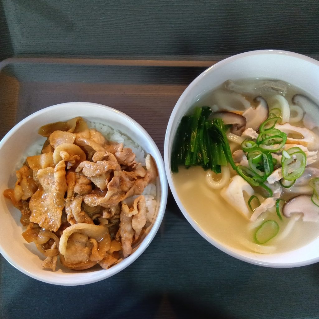 今日のランチメニューは、鶏だし塩うどん・ミニ豚丼です!